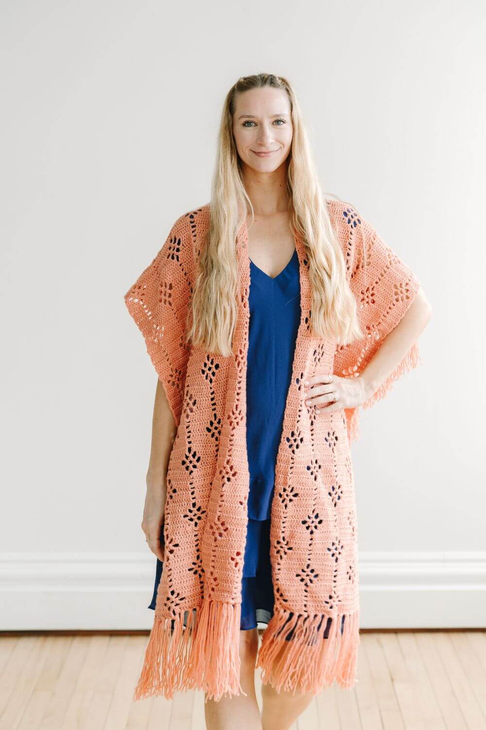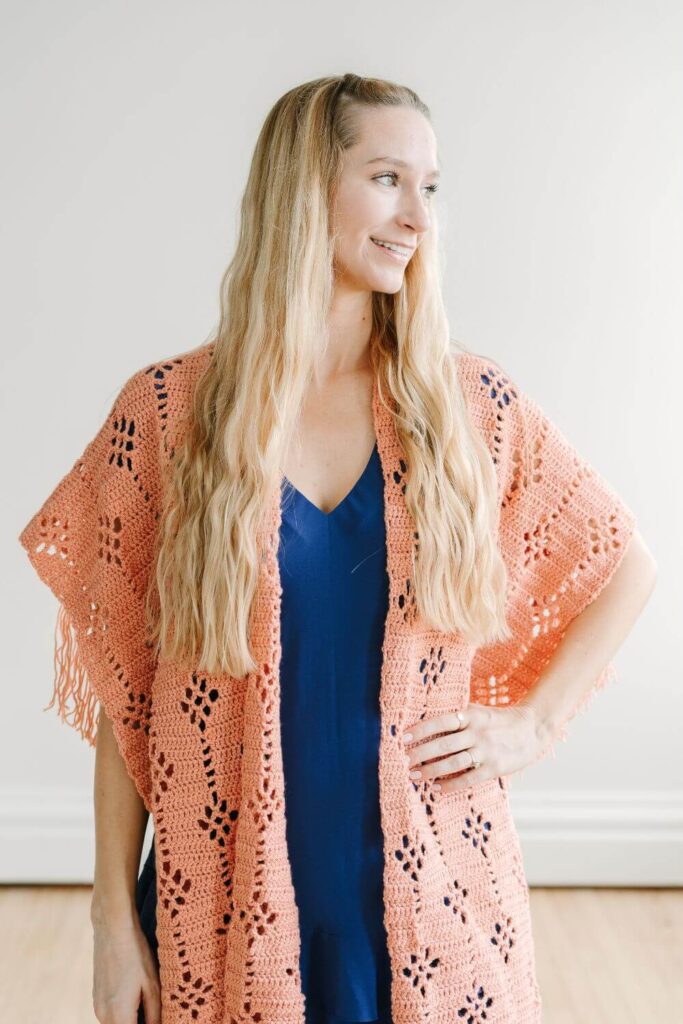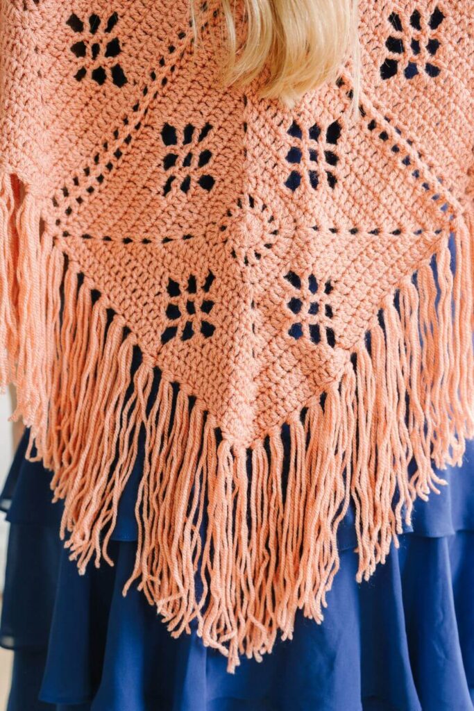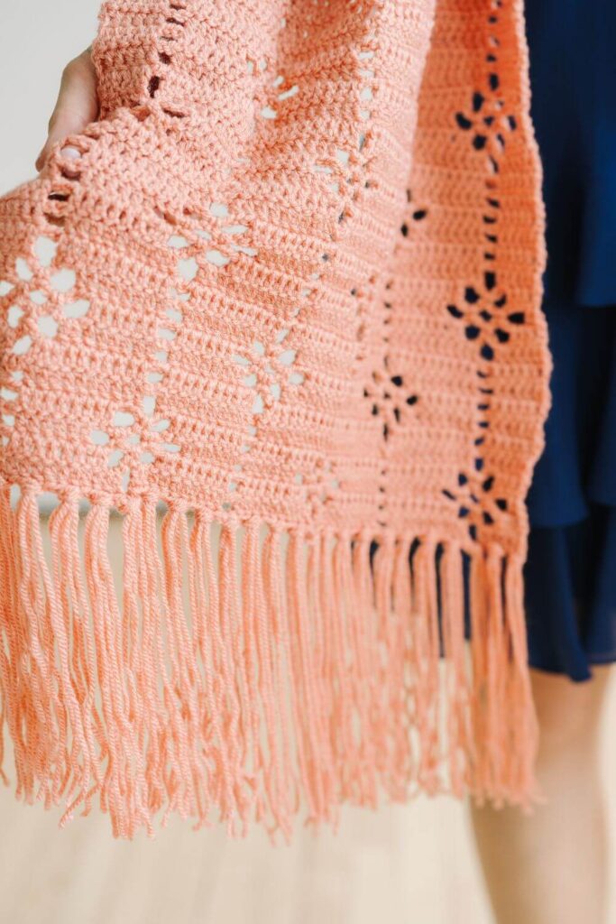 At the heart of the design is a mesmerizing filet stitch pattern that’s just as joyful to crochet as it is to wear. It’s rhythmic, calming, and deeply satisfying, making the shawl as enjoyable to create as it is to style.