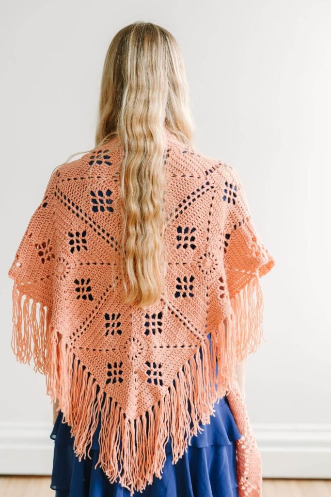 The back of the shawl features four square motifs, joined seamlessly with crochet — no sewing required. From there, the front panels flow gracefully from either side, creating a beautifully unique pattern that makes you stand out.